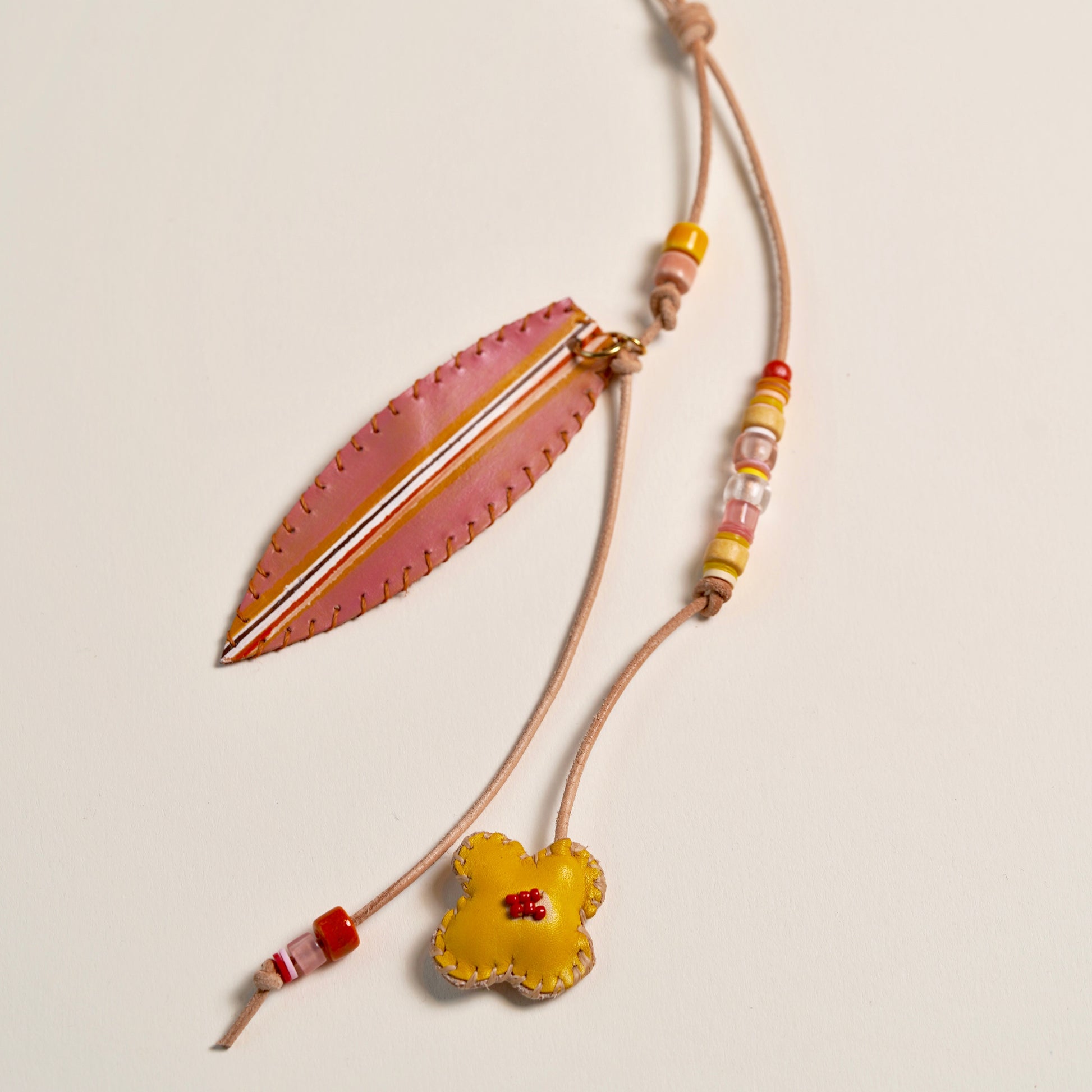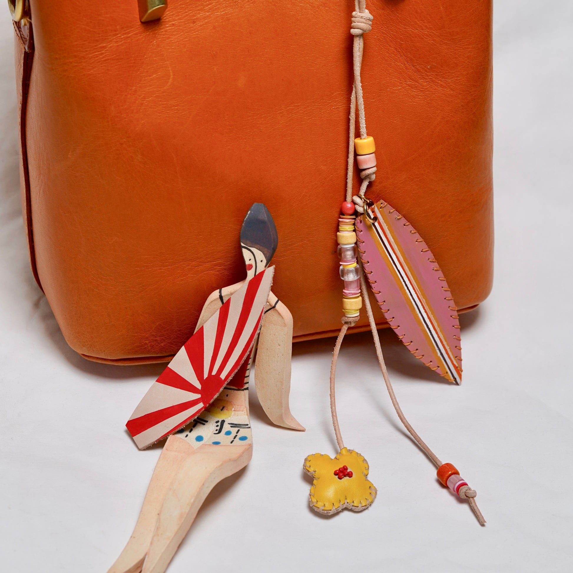 Each charm features a hand-painted leather element, carefully colored by hand to create one-of-a-kind patterns and shades. This artistic touch is complemented by hand-sewn detailing, adding depth, texture, and exceptional quality. Every stitch underscores the individuality and craftsmanship behind each piece — making every charm truly unique.